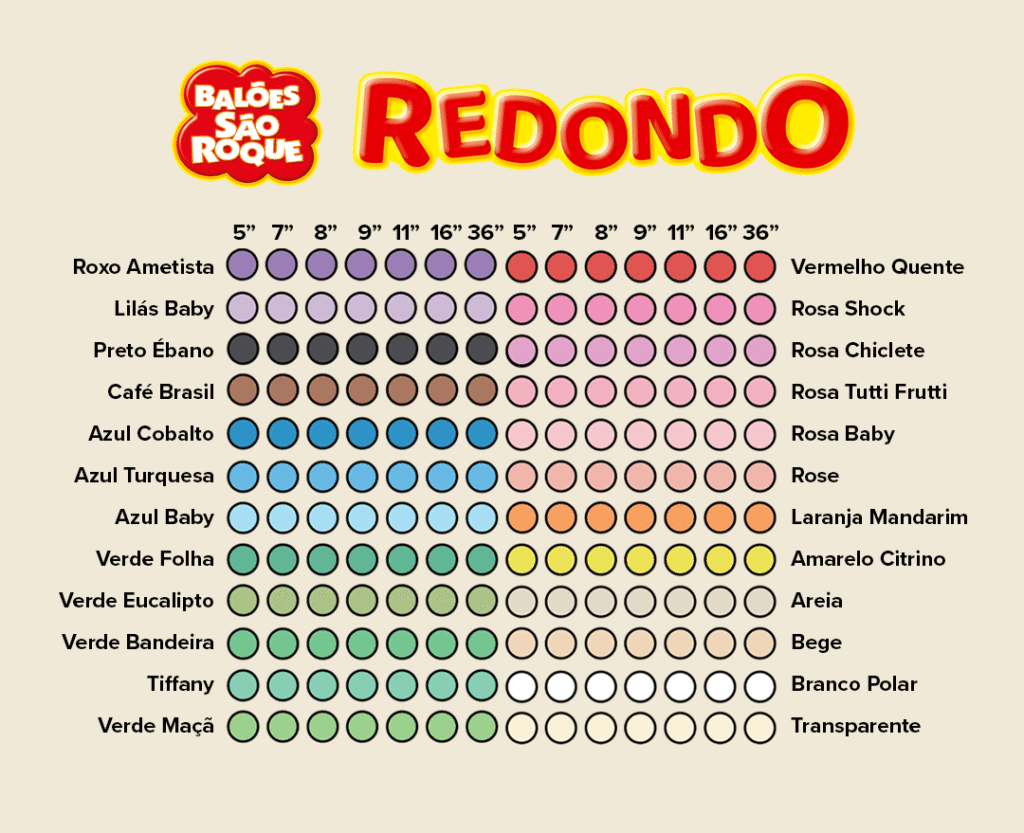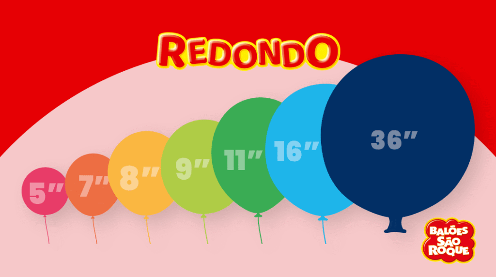 A linha Lisos Redondos é a que possui a maior gama de polegadas disponíveis: são sete tamanhos de balões, sendo 5”, 7”, 8”, 9”, 11, 16 e 36”. Por isso, é a mais versátil do catálogo, oferecendo a flexibilidade necessária para qualquer tipo de decoração, desde detalhes até grandes estruturas.