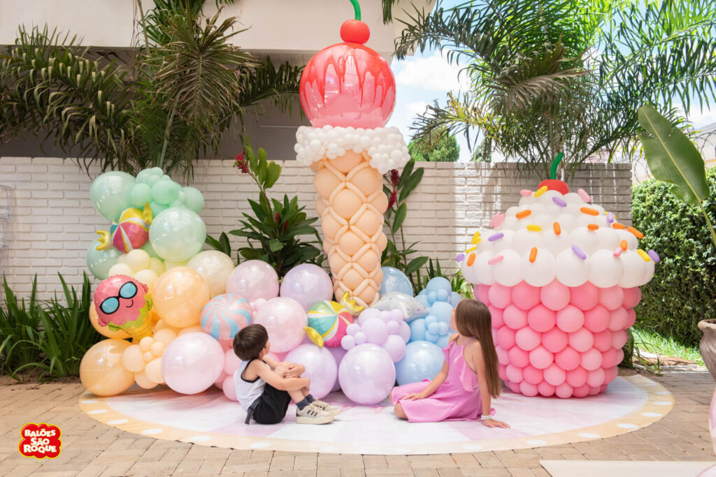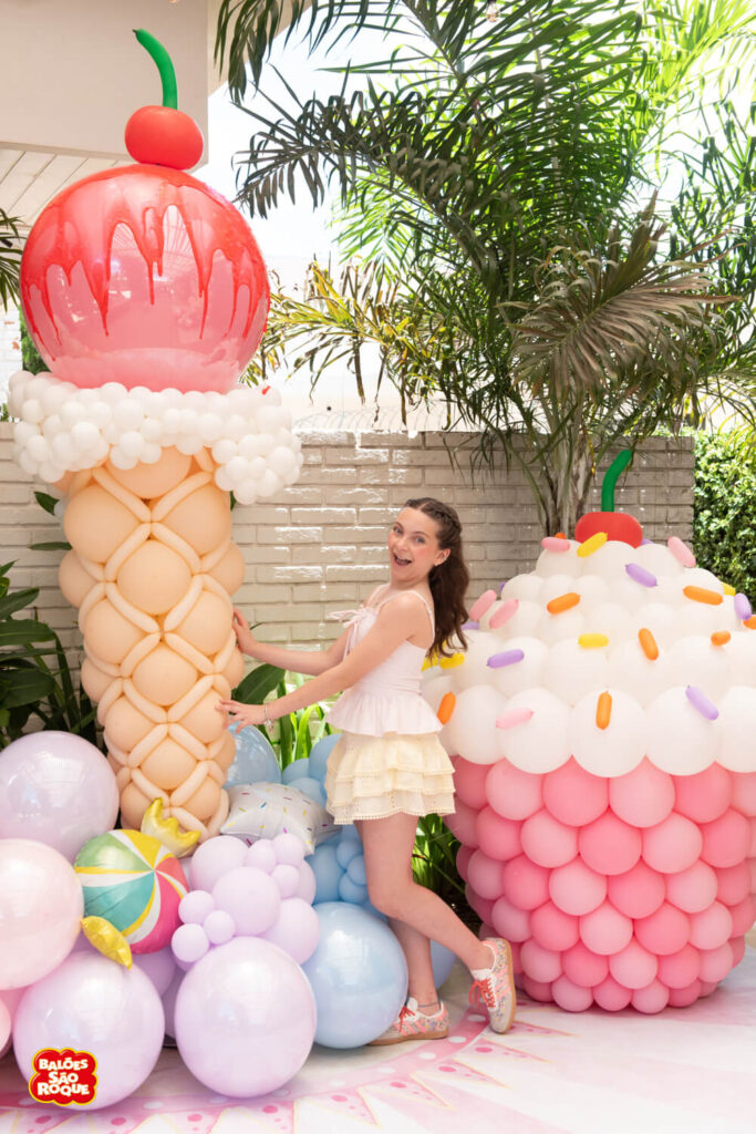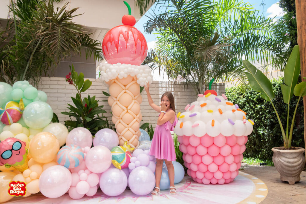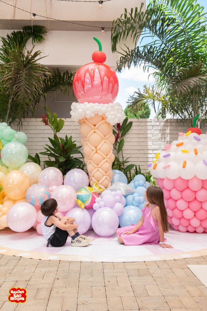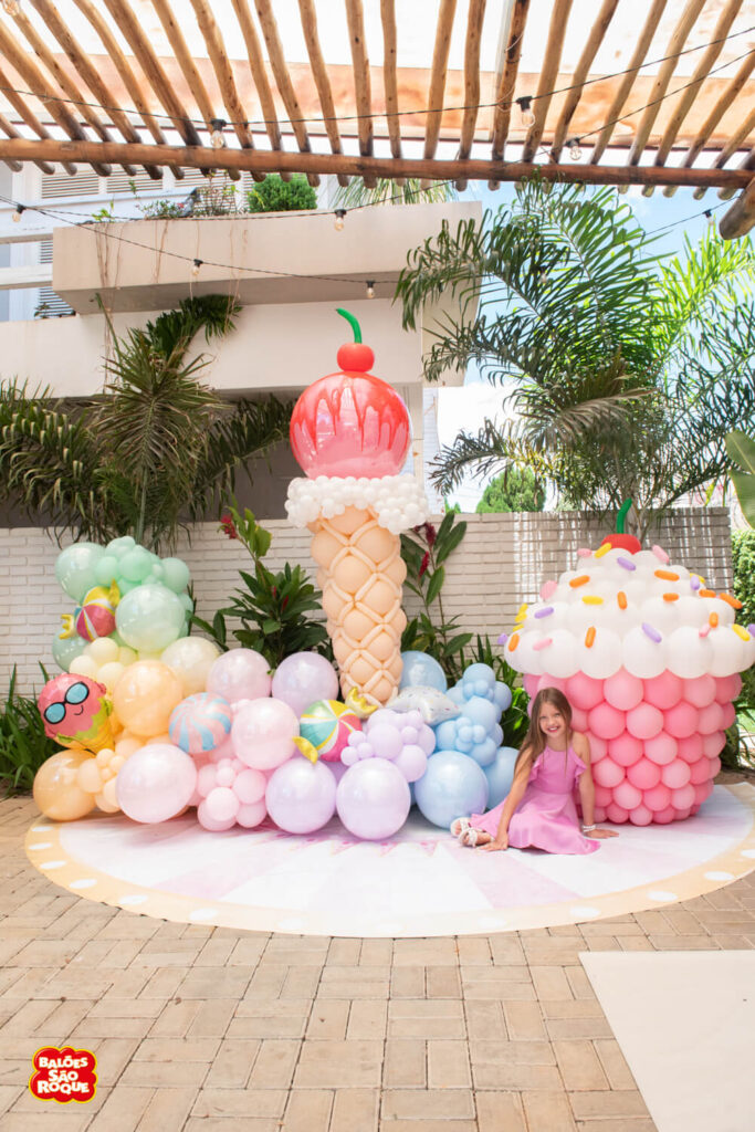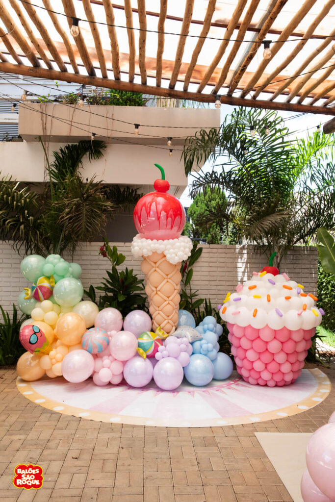 Essa composição aposta em esculturas de sorvete e cupcake para criar um cenário divertido e cheio de personalidade. Ideal para festas infantis, com impacto visual super lúdico!