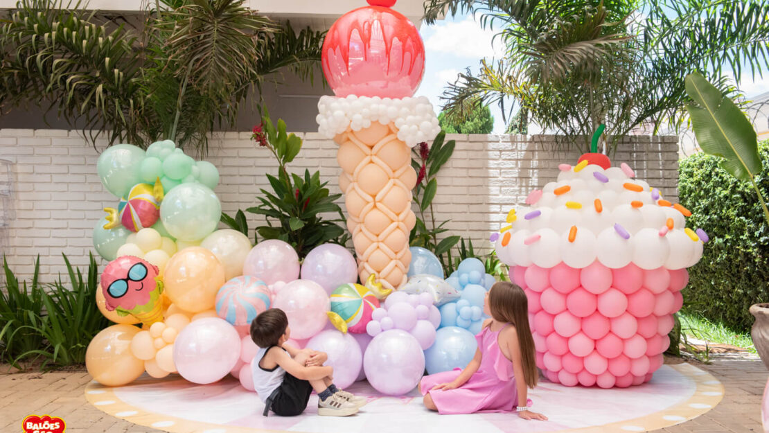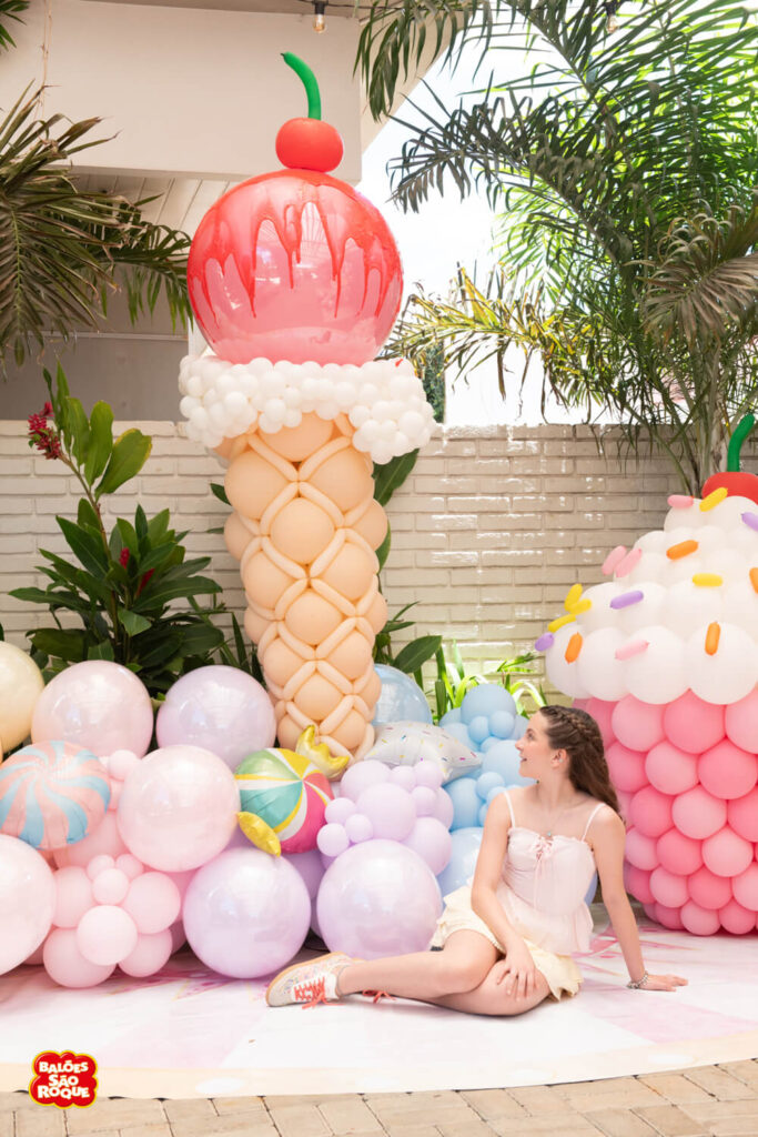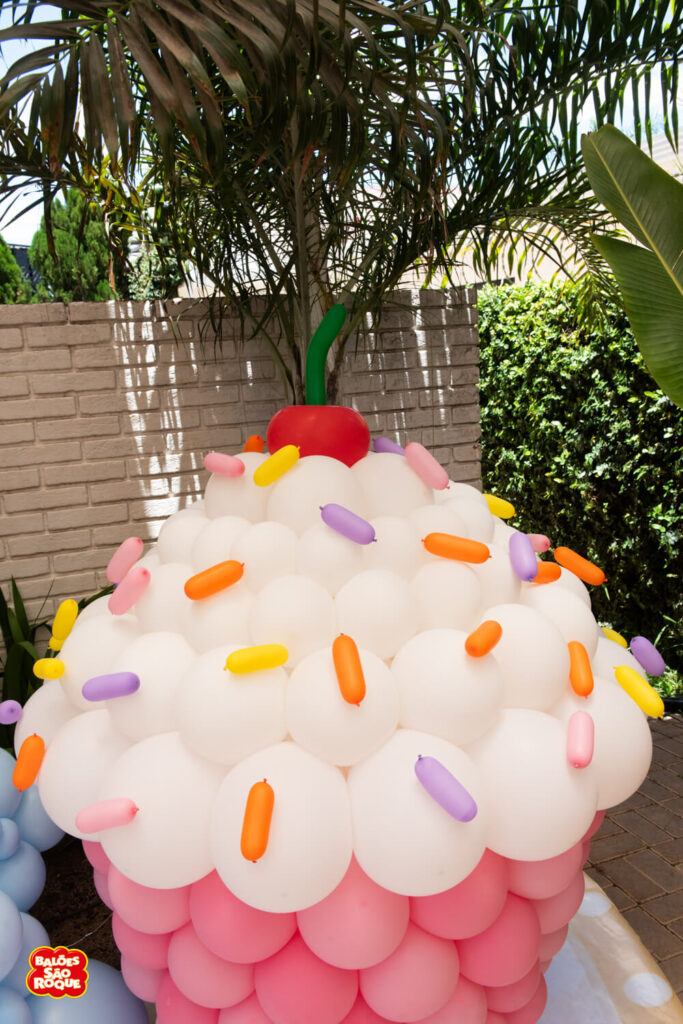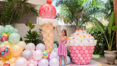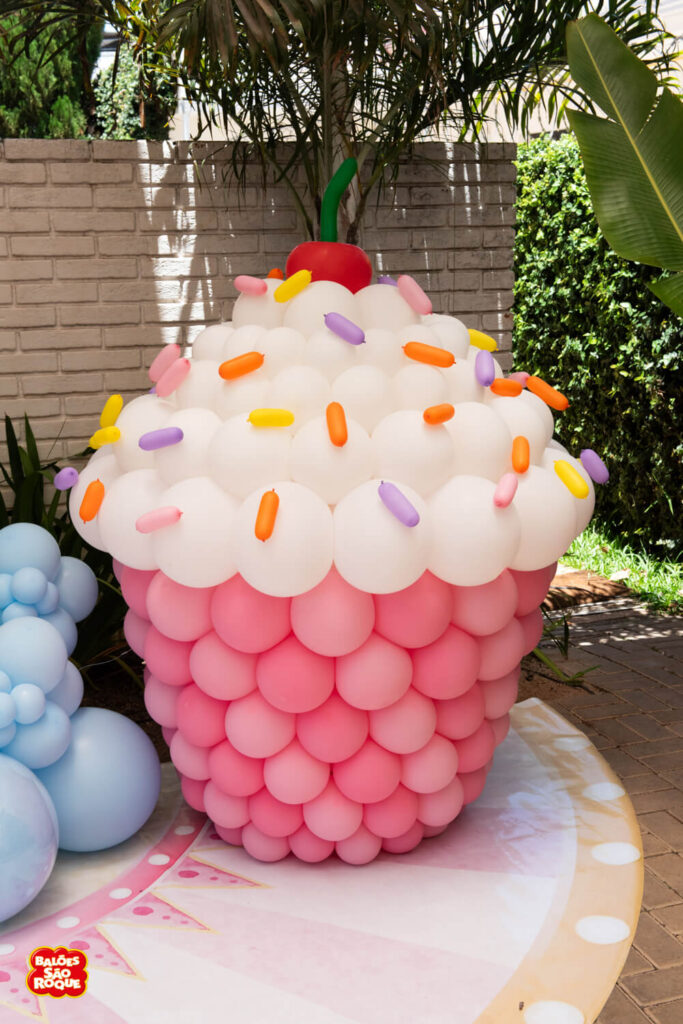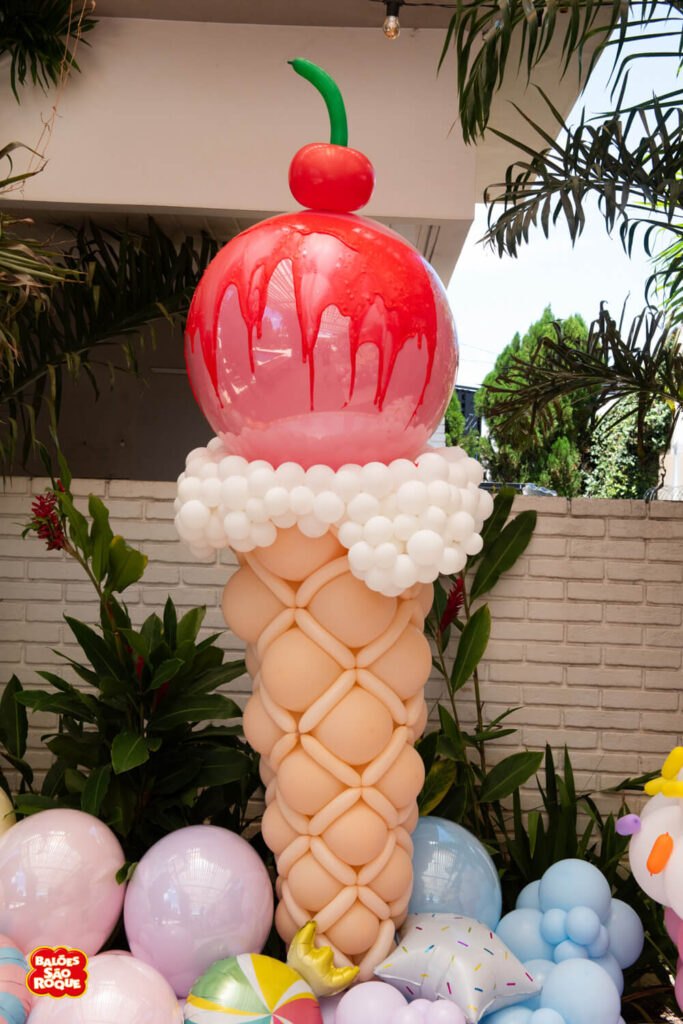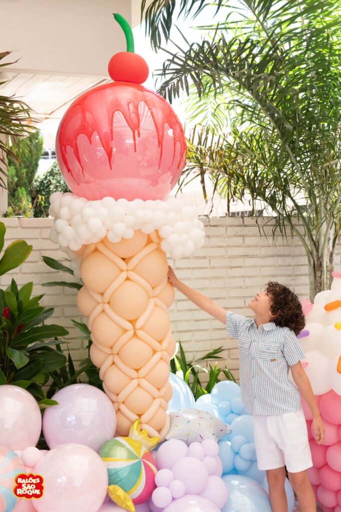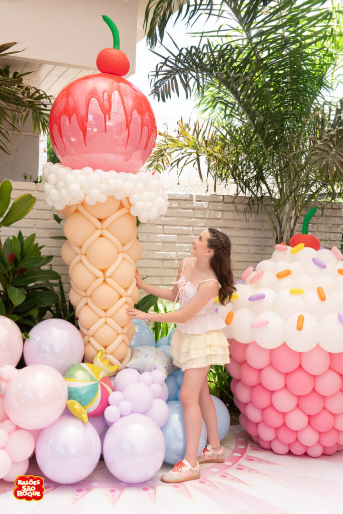 Essa composição aposta em esculturas de sorvete e cupcake para criar um cenário divertido e cheio de personalidade. Ideal para festas infantis, com impacto visual super lúdico!