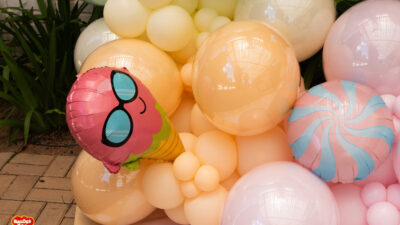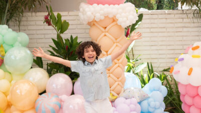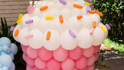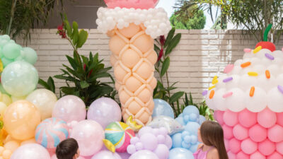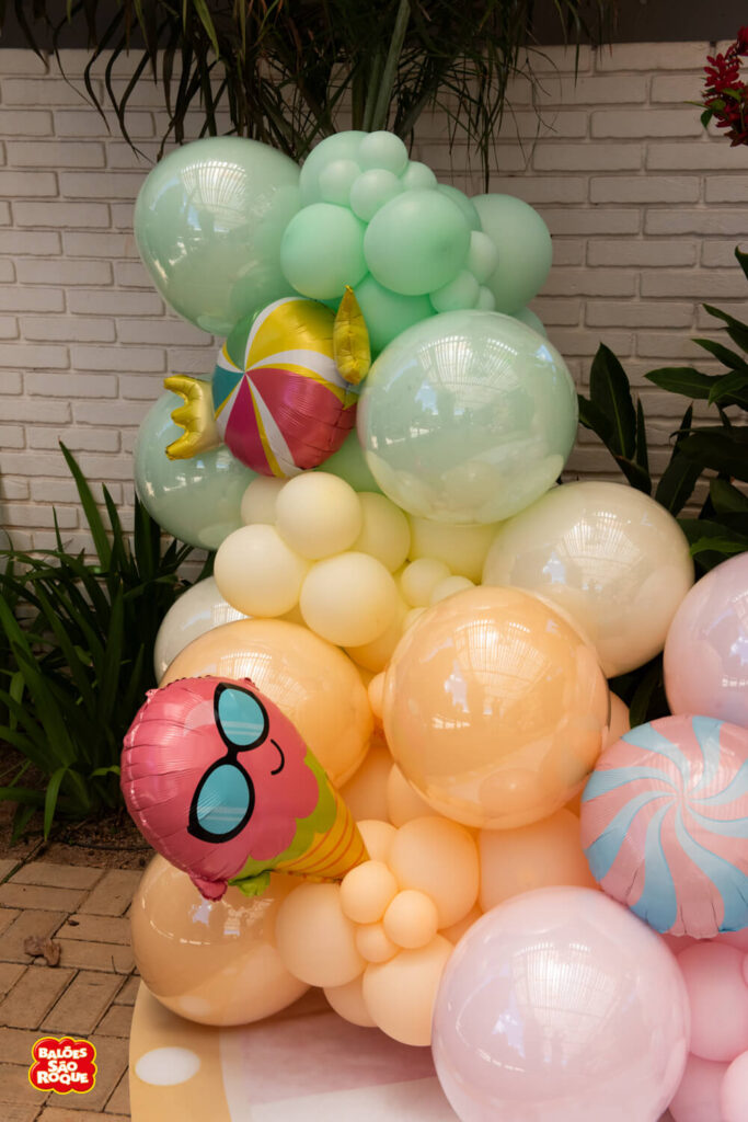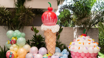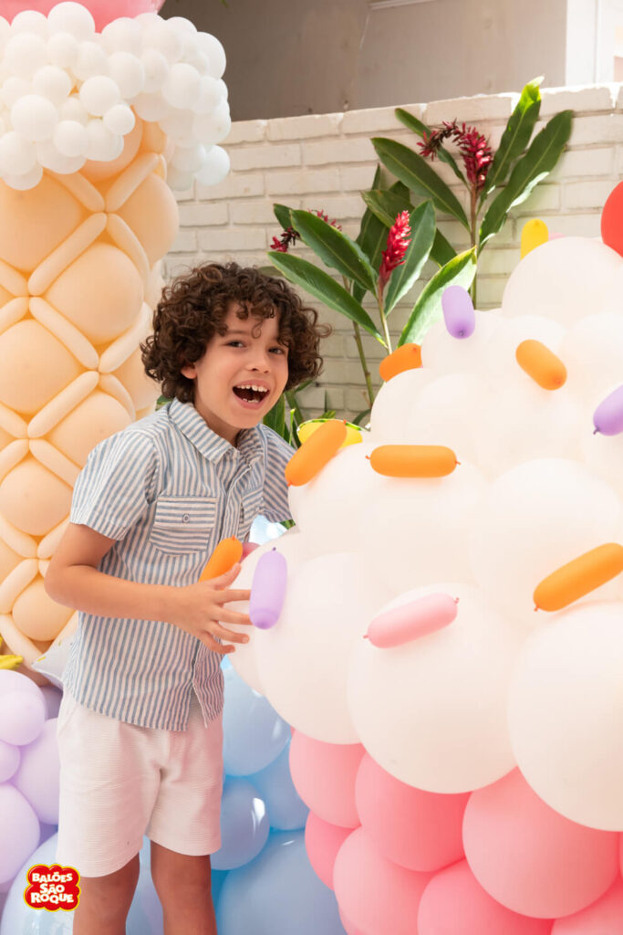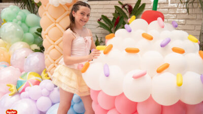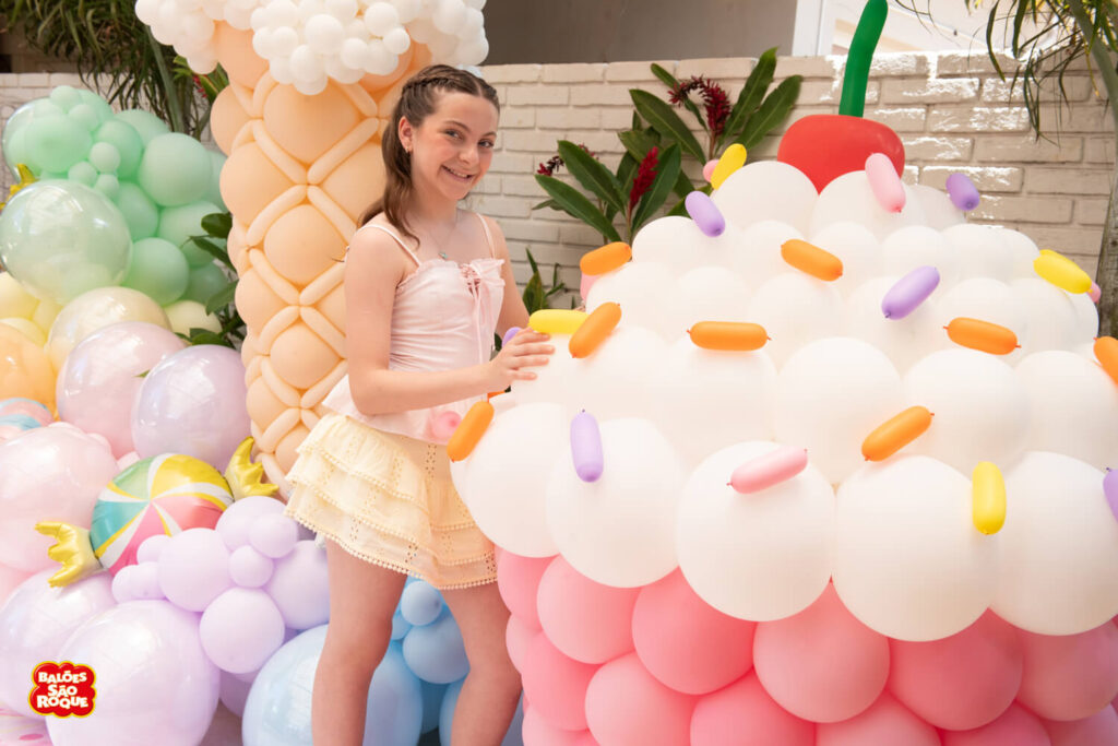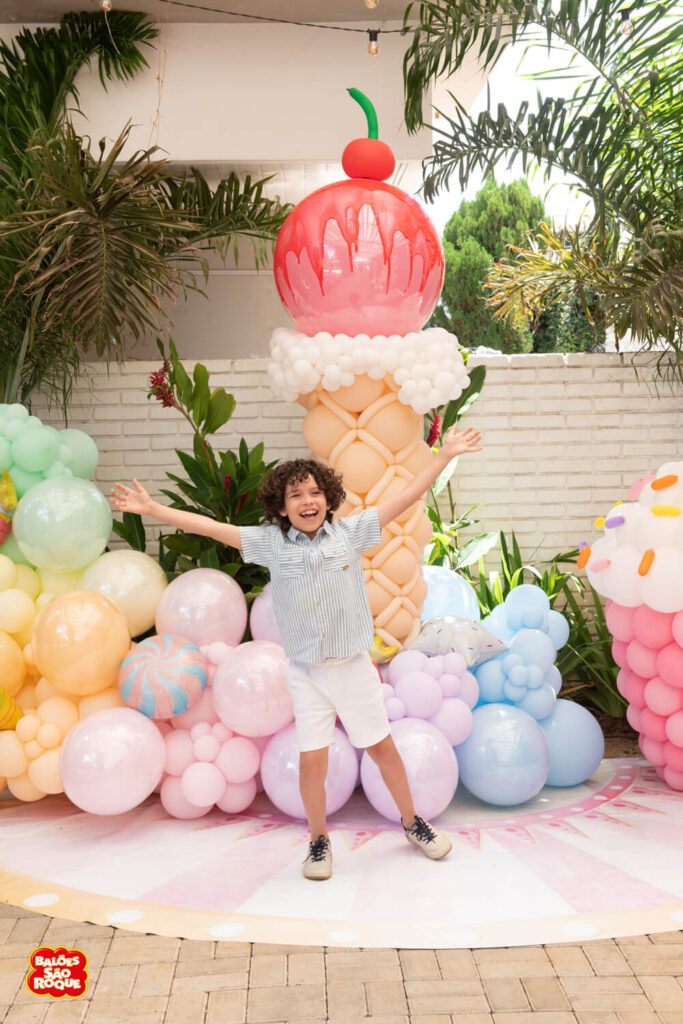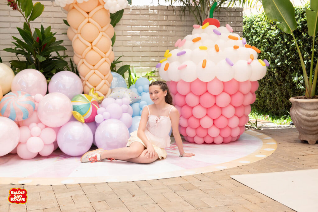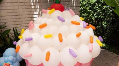 Essa composição aposta em esculturas de sorvete e cupcake para criar um cenário divertido e cheio de personalidade. Ideal para festas infantis, com impacto visual super lúdico!