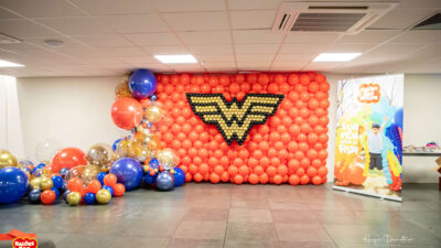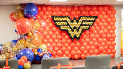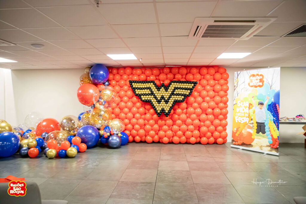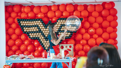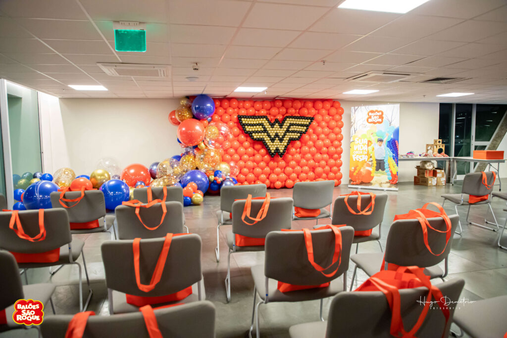 Com balões nas cores que remetem à heroína, a decoração ganhou vida com um painel bem grande e um arco orgânico impactante. Esse tema é uma verdadeira explosão de cor, ideal para festas infantis!