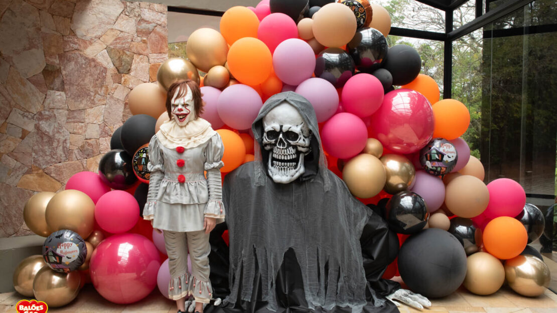 O mural orgânico, criado com a combinação dos Lisos Redondos, Metallic Balloons, Uniq, Balão Bolha e Metalizados Redondos, forma um cenário impactante, que une texturas e contrastes para transformar o ambiente em uma verdadeira experiência visual da data mais assustadora do ano.