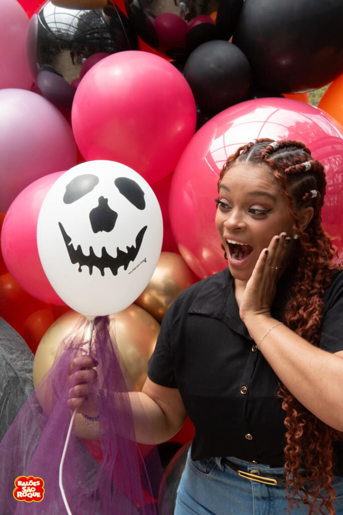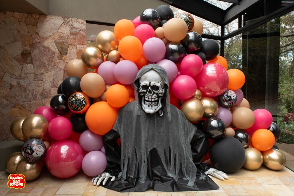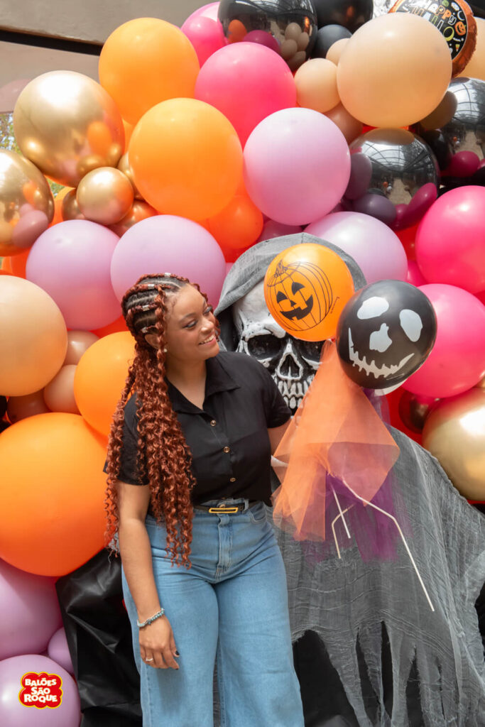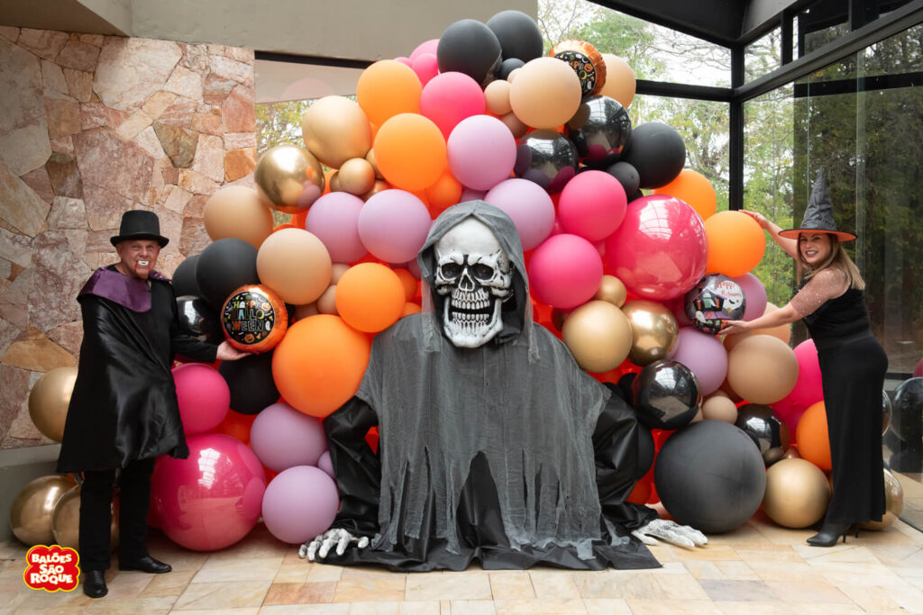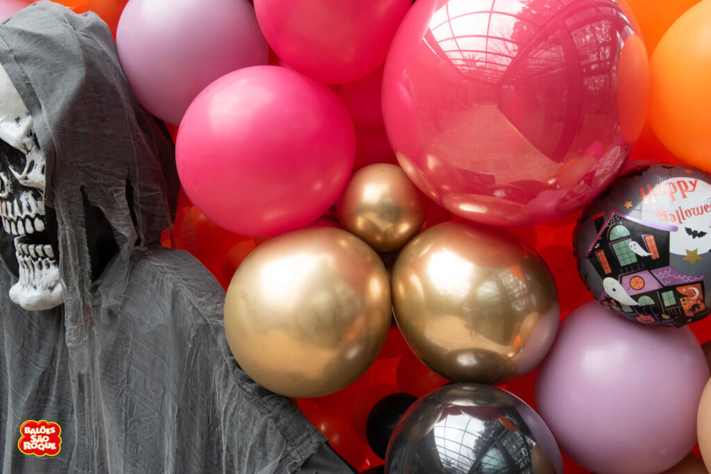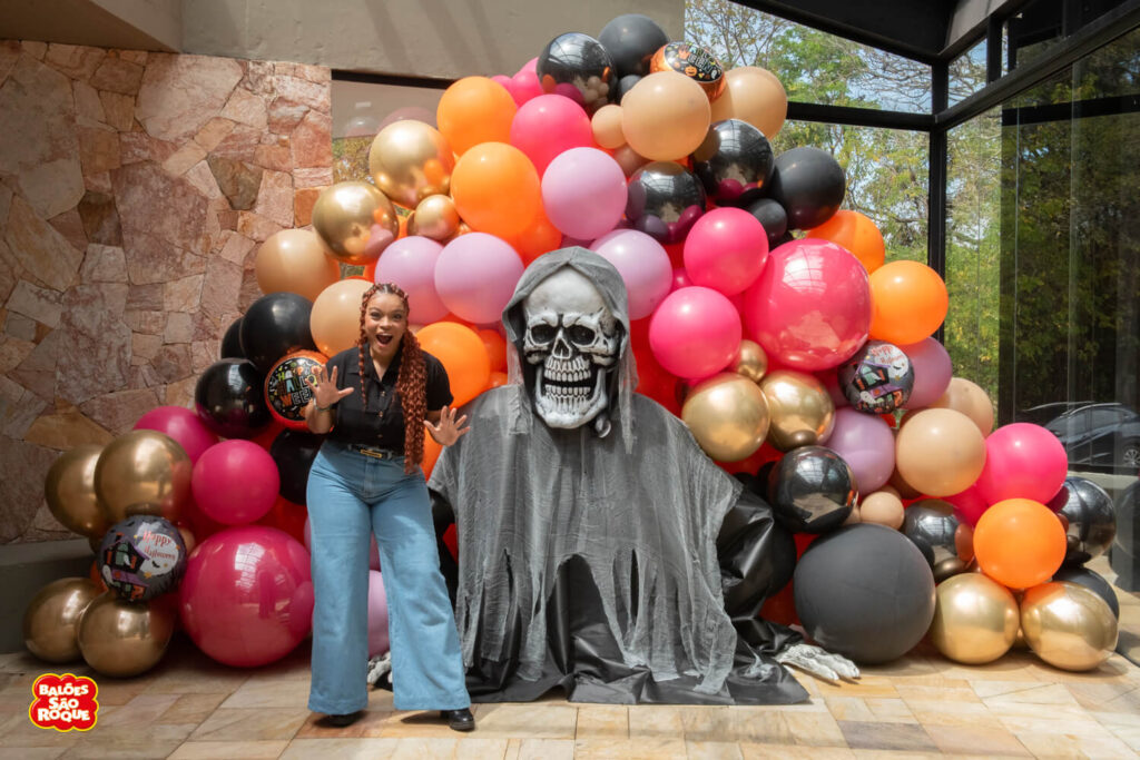 O mural orgânico, criado com a combinação dos Lisos Redondos, Metallic Balloons, Uniq, Balão Bolha e Metalizados Redondos, forma um cenário impactante, que une texturas e contrastes para transformar o ambiente em uma verdadeira experiência visual da data mais assustadora do ano.