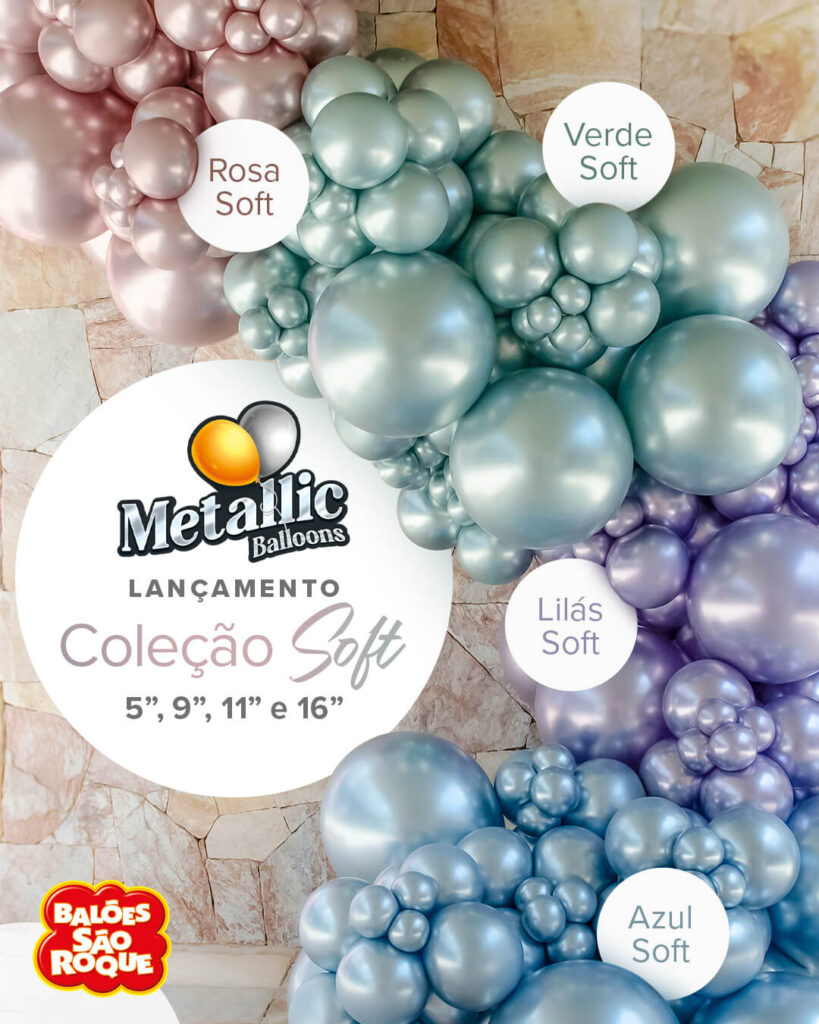 Além de tudo isso, dentro da linha Metallic destacamos a coleção Soft, com 4 tons suaves, buscando oferecer mais possibilidades aos nossos clientes que gostam de seguir tendências do mercado de festas.