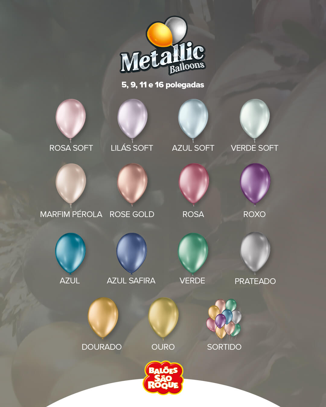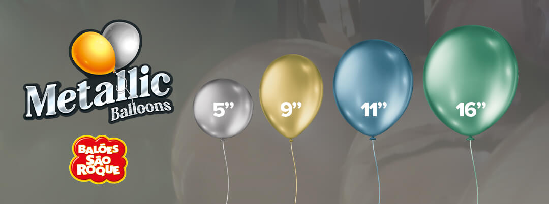 A linha Metallic Balloons foi desenvolvida para atender projetos de decoração que exigem sofisticação e visual de alto impacto. Com brilho metálico intenso, que reflete a elegância dos metais preciosos, esses balões são muito procurados por decoradores profissionais, para valorizar e refinar as produções.